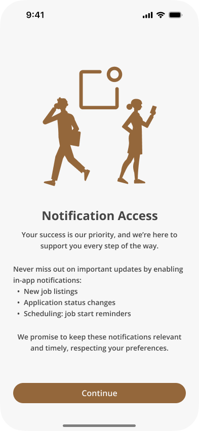 The screens below capture a high priority change we made to this user flow, providing relevant context behind the request before surfacing the native device prompt. Similar changes were made for other device prompts such as Calendar access to add shifts with all relevant details to the user’s calendar app.