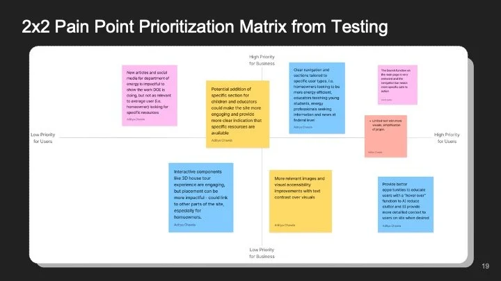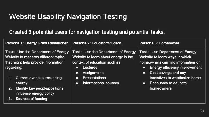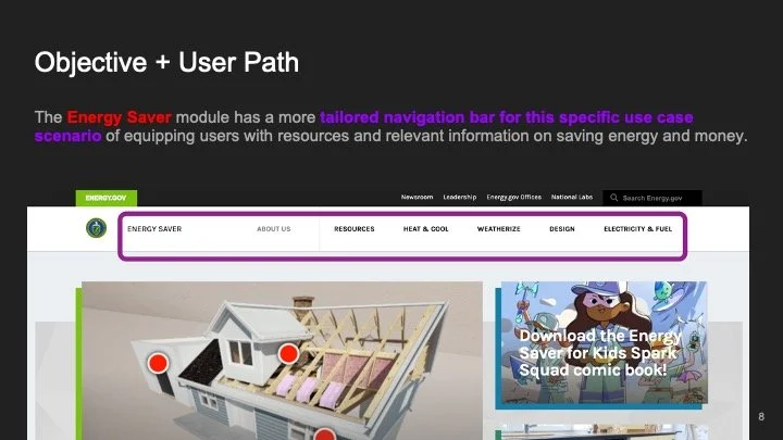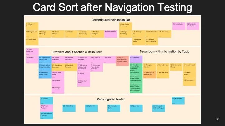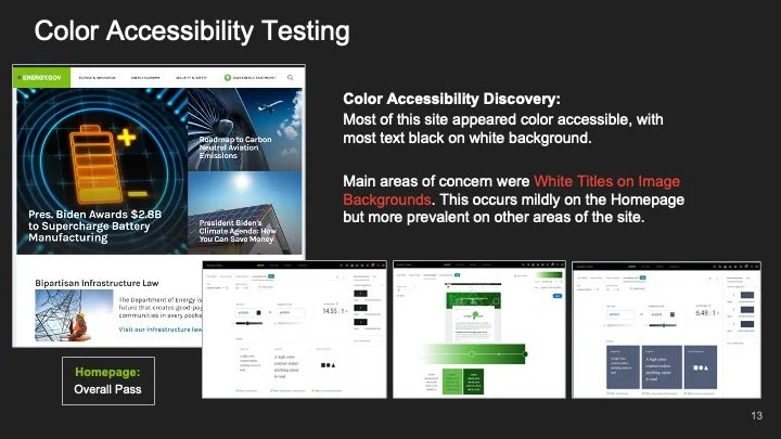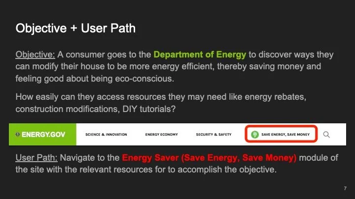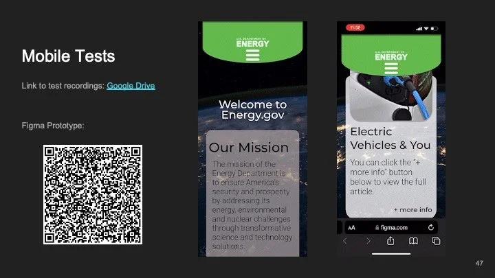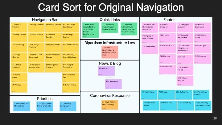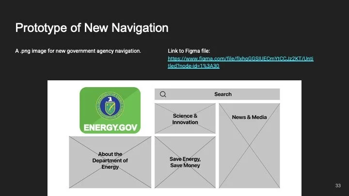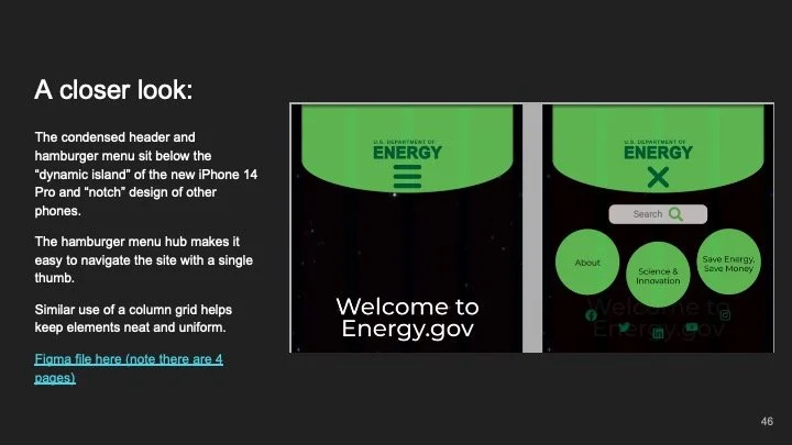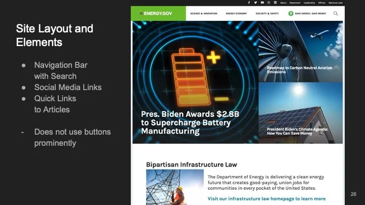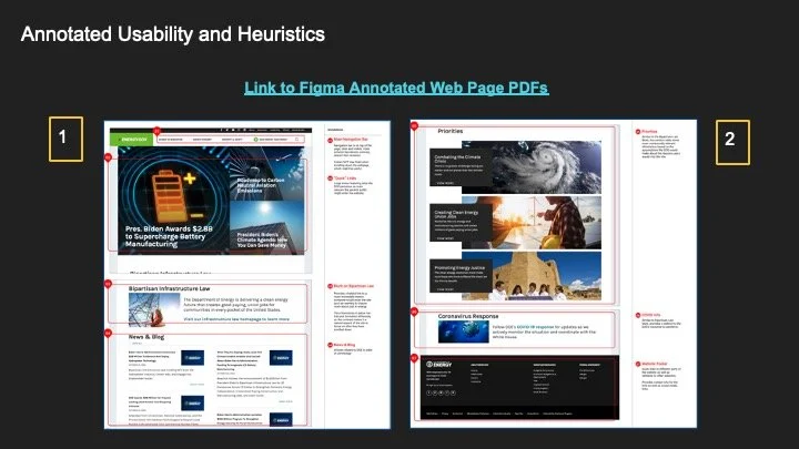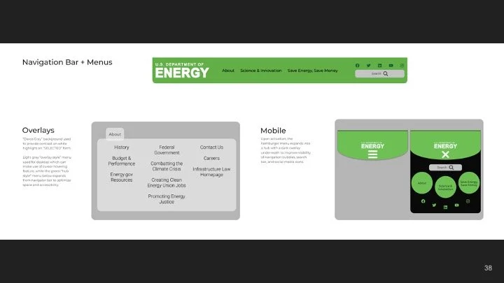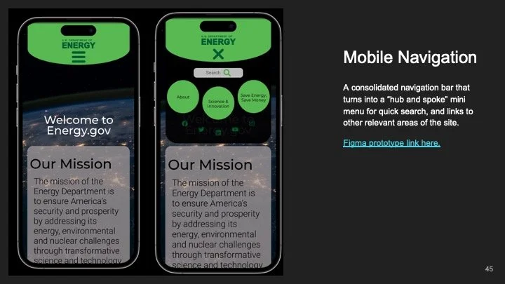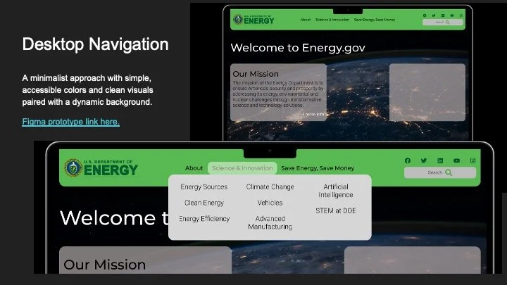 The Problem: The Department of Energy (DOE) website is a valuable resource for information about energy policy, research, and programs. However, the website can be difficult to use. The navigation is cluttered and especially difficult to navigate on mobile, and there are many visual accessibility conflicts with text, color, and images. As a result, users often have difficulty finding the information they need.